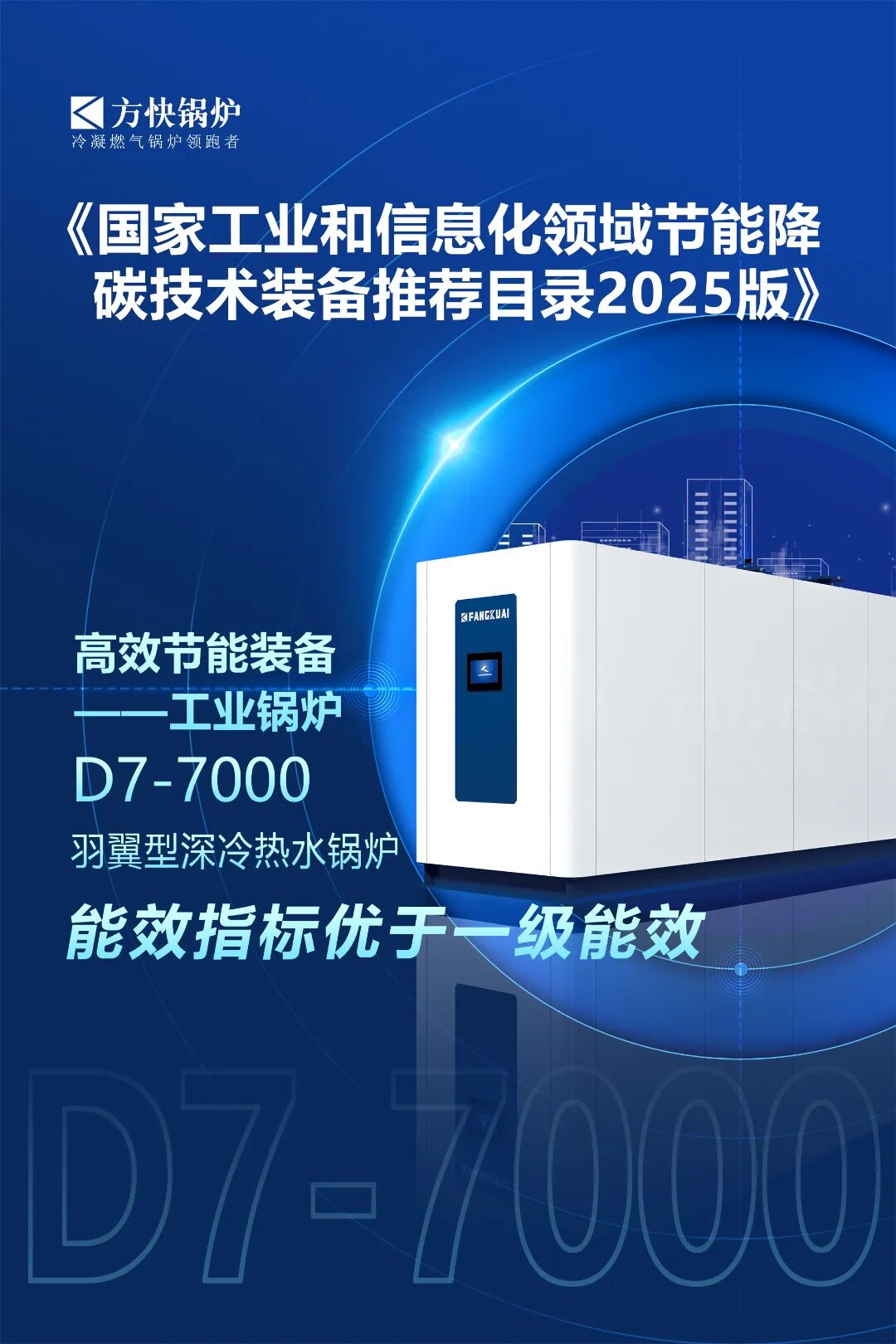 近日,工業和信息化部節能與綜合利用司發布《國家工業和信息化領域節能降碳技術裝備推薦目錄(2025年版)》,方快自主研發的“羽翼型深冷熱水鍋爐(型號:D7-7000)”,獲評“優于1級能效”,此次入選,是國家對方快在節能降碳技術領域持續創新的高度認可。