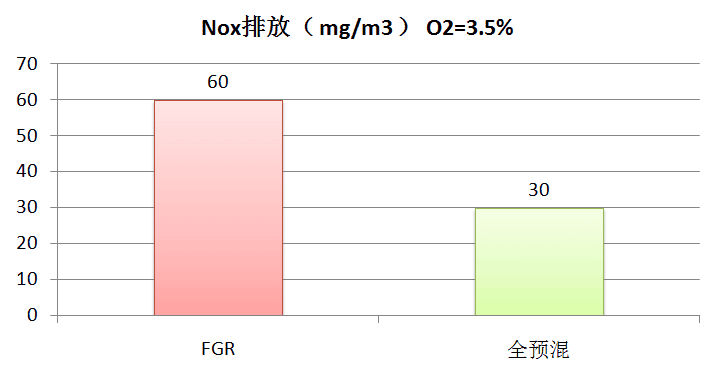 FGR 在配套普通爐體時,可保證 NOx 在 60mg/m ³以下,若在放大爐膛的情況下,可基本實現 75% 負荷以下實現 30mg/m ³,而全預混則可保證滿負荷情況下實現 30mg/m ³,較大氧含量情況下可實現 18mg/m ³以下。