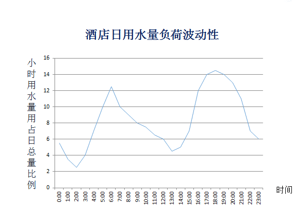 由于經(jīng)濟型酒店以客房服務為主的特點,以及入住率的影響,導致酒店全天的熱水用量負荷波動較大,用水較為集中,會出現(xiàn)兩個高峰階段(早高峰、晚高峰),高峰用水量占總用水量的 70%~80% 。