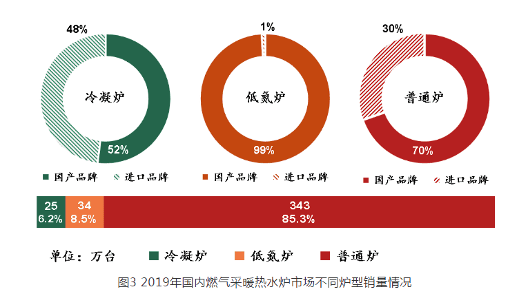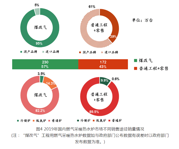 2019 年用于“煤改氣”工程的燃?xì)獠膳療崴疇t銷量為 230 萬臺(tái),占全年總銷量的 57% ,相比 2018 年(“煤改氣”工程用銷量 145 萬臺(tái))增幅 58.6% 。其中,冷凝爐銷量為 8 萬臺(tái),占“煤改氣”工程總銷量的 3.5% ;低氮爐銷量為 33 萬臺(tái),占“煤改氣”工程總銷量的 14.3% ;普通爐銷量為 189 萬臺(tái),占“煤改氣”工程總銷量的 82.2% 。國產(chǎn)品牌銷量為 219 萬臺(tái),占“煤改氣”工程總銷量的 95% ;進(jìn)口品牌銷量為 11 萬臺(tái),占“煤改氣”工程總銷量的 5% 。