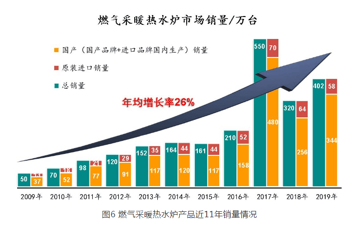 根據(jù)統(tǒng)計(jì)數(shù)據(jù),自 2009 年以來燃?xì)獠膳療崴疇t產(chǎn)品銷量急劇上升,中國國內(nèi)市場 2009 年銷量為 50 萬臺(tái)(原裝進(jìn)口 13 萬臺(tái)),截至 2019 年底,國內(nèi)市場銷量達(dá)到了 402 萬臺(tái)(原裝進(jìn)口 58 萬臺(tái)),年均增長率達(dá) 26% ,遠(yuǎn)遠(yuǎn)超出中國經(jīng)濟(jì)發(fā)展的平均速度。