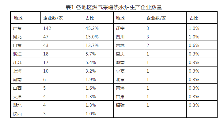 截止 2019 年 8 月底,有 314 家企業(yè)獲得了燃?xì)獠膳療崴疇t生產(chǎn)許可證。國內(nèi)各地區(qū)燃?xì)獠膳療崴疇t生產(chǎn)企業(yè)數(shù)量和分布情況見表 1 和圖 1 。