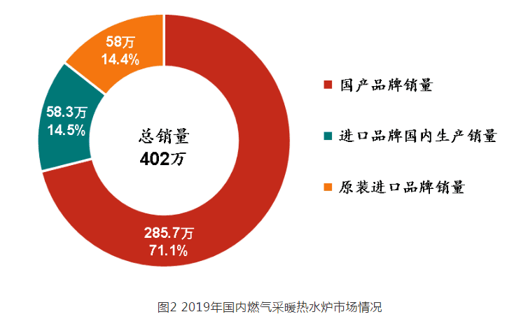 據(jù)統(tǒng)計(jì), 2019 年中國市場燃?xì)獠膳療崴疇t總銷量為 402 萬臺(tái),相比 2018 年( 320 萬臺(tái))增加了 82 萬臺(tái),增幅 25.6% 。其中,國產(chǎn)品牌國內(nèi)銷量為 285.7 萬臺(tái),占全年總銷量的 71.1% ,相比 2018 年( 214 萬臺(tái))增幅 33.5% ;進(jìn)口品牌在國內(nèi)生產(chǎn)的銷量為 58.3 萬臺(tái),占全年總銷量的 14.5% ,相比 2018 年( 42 萬臺(tái))增幅 38.8% ;原裝進(jìn)口品牌的銷量為 58 萬臺(tái),占全年總銷量的 14.4% ,相比 2018 年( 64 萬臺(tái))降幅 9.4% 。